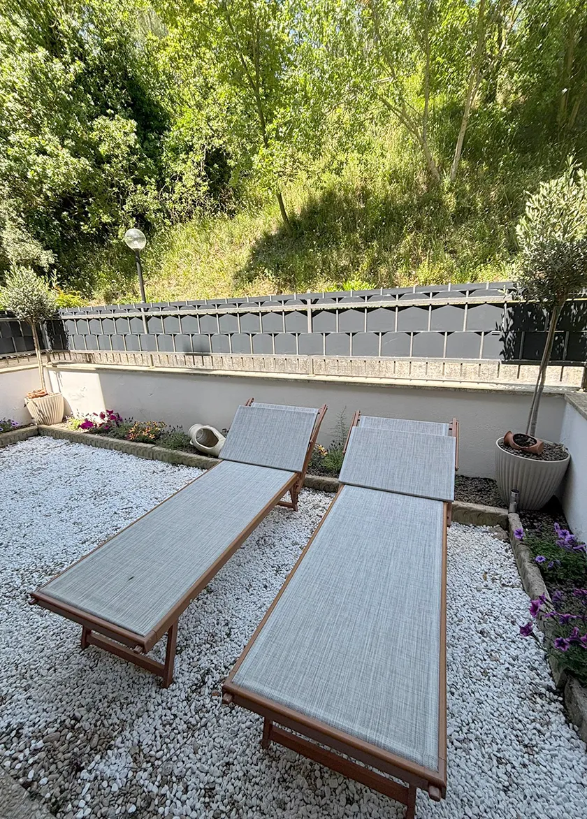 Un incantevole giardino privato immerso nel verde renderà ancora più piacevoli i tuoi momenti di relax, con due comode sdraio a tua disposizione.